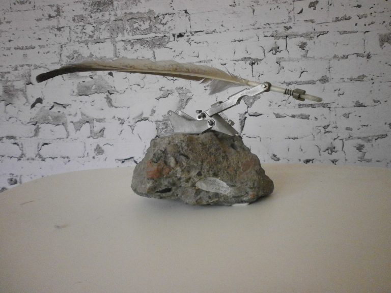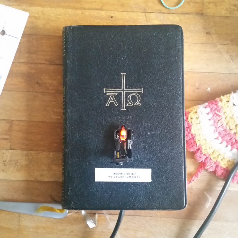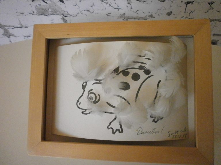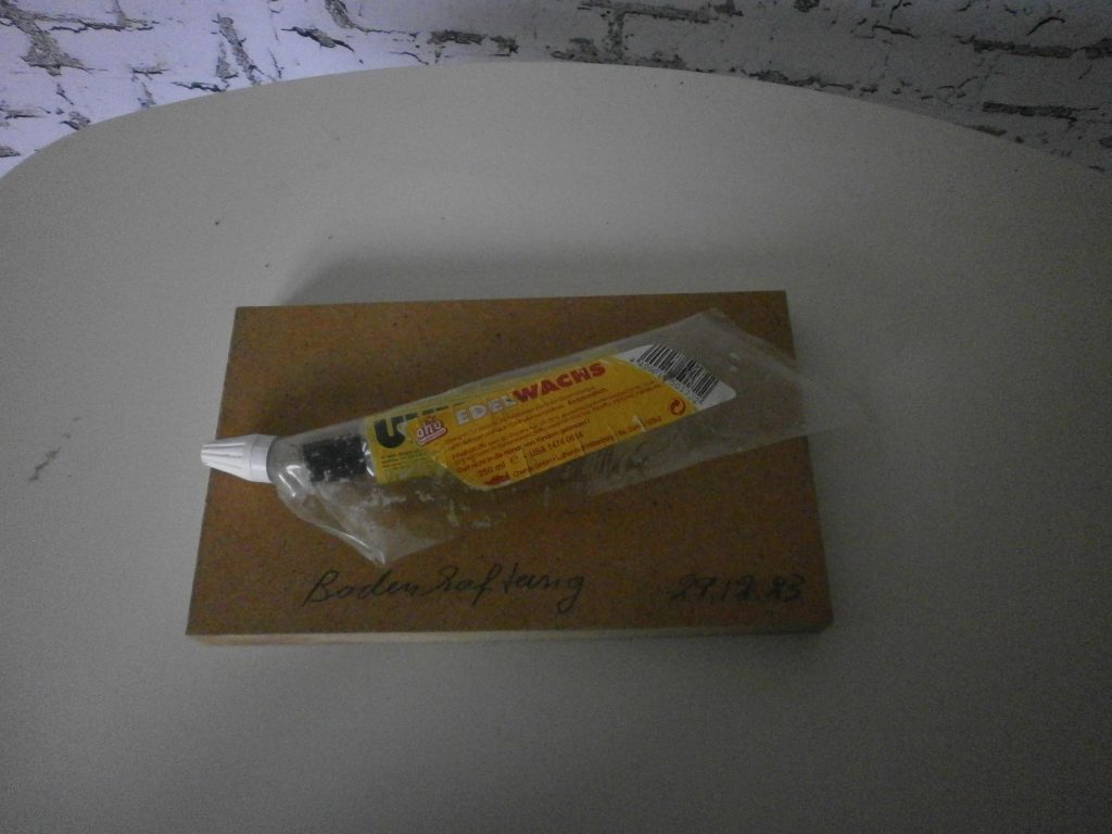Die Idee kam bei einer Kultursendung im Radio, die recht schwülstig und akademisch war :“ Der Künstler stellt in seiner Arbeit die Metamorphose im transzendentalen Raum mit der Absicht der Befreiung des Individuums von seinen sublimierten ….bla,bla,bla“ . Da fehlte mir die Bodenhaftung, zumal ich weiß, dass viele Künstler bodenständig mit beiden Füßen auf der Erde stehen. Im Skizzenbuch ist noch eine Tube Pattex eingezeichnet, die aber in 2023 ein anderes Design bekommen hat, welches nicht meinen Vorstellungen entspricht, aber UHU tut es auch. Die fehlende Bodenhaftung sehe ich gerade in der Blase Berlin, die in einem eigenem Universum schweben