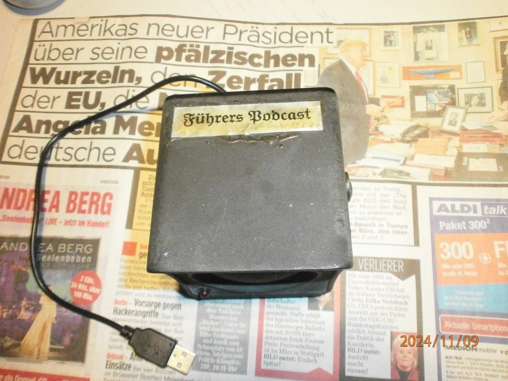 Anmerkung, es ist ein Lautsprcher aus dem VE 301 verbaut, der Volksempfänger war ein Meisterstück der Propaganda. Das Objekt hat unten ein Radio, welches fest auf “ Klassik auf Wunsch “ eingestellt ist.