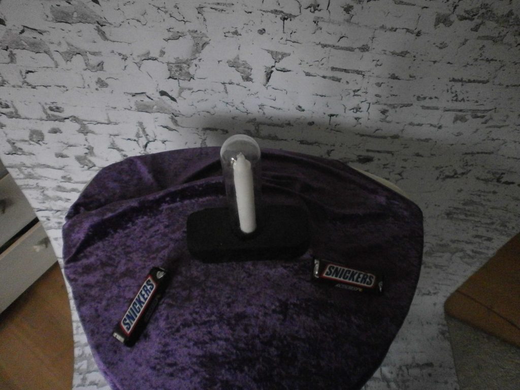 Es ist ein normales Teelicht und eine elektronische Adaption zu sehen. Aus der Physik wissen wir, dass ein Objekt vor dem Spiegel genauso weit hinter dem Spiegel zu sehen ist. Mit etwas Geschick kann man das wahre Teelich so positionieren, das die Flamme scheinbar über der LED Adaption zu sehen ist.