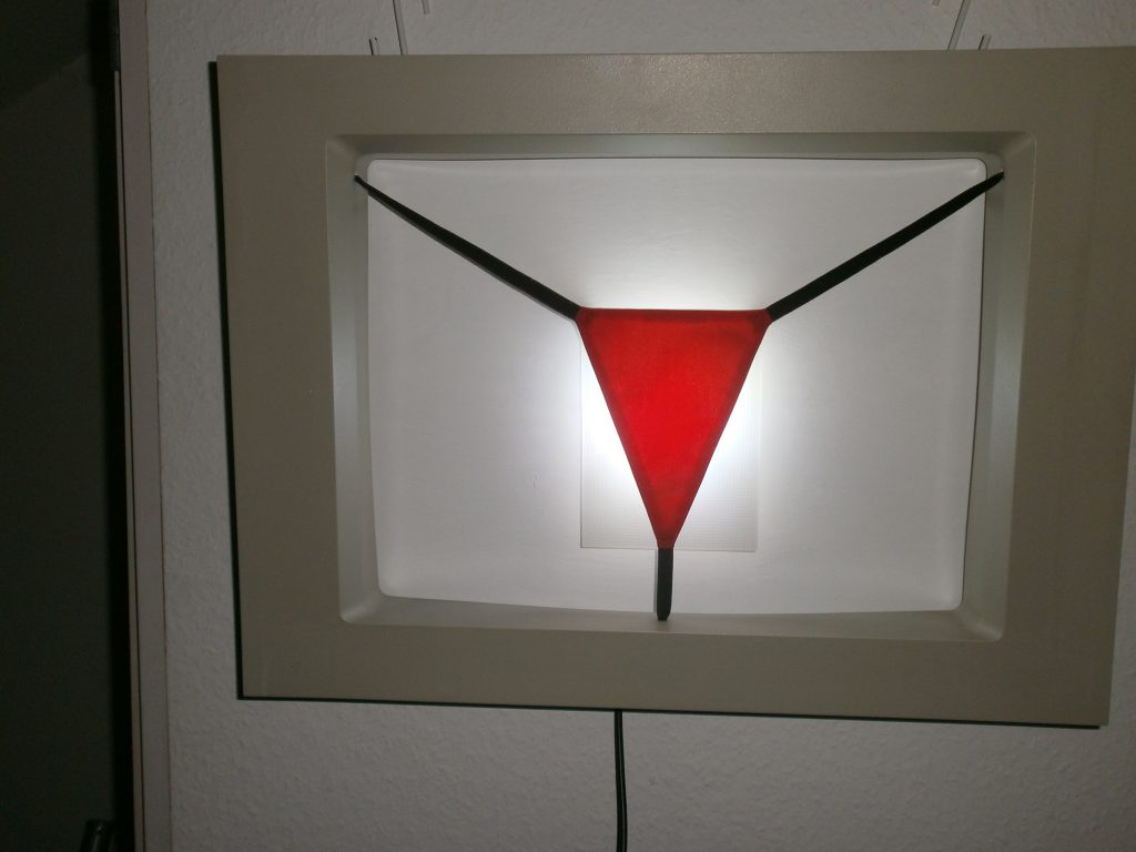 fern sehen ist ein Objekt, bei dem ich den Bogen von der Peep Show, dem Rotlicht Milieu und dem Reiz des Verborgenen spanne. Eine schöne Arbeit, die Elemente meiner Berufstätigkeit, hier ein Monitorrahmen aus dem Leitsystem, einem Tanga und einem sogenannten TV Simulator aufnehme.